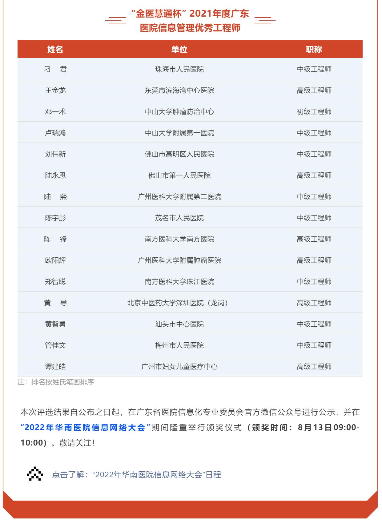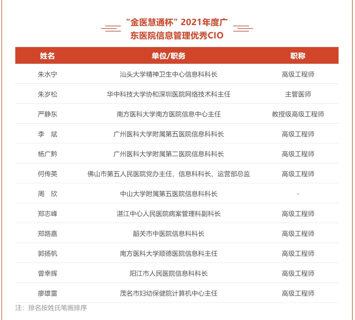 为深入贯彻学习“十四五”期间公立医院高质量发展工程,促进“智慧医院”建设,通过信息化手段提升医疗服务的效率、质量与安全,进一步推进《关于推动公立医院高质量发展的意见》等方针政策的贯彻落实,推动智慧医疗、智慧服务、智慧管理“三位一体”的智慧医院建设,总结和交流近年来医疗健康信息化建设工作经验和科研成果,弘扬和表彰在医院信息化建设中做出突出贡献的领导者、管理者、组织者和实践者,实现表彰先进、树立典型,加快利用信息化创新医疗卫生规范管理和医疗服务模式,提升医疗机构竞争力和影响力,促进医院信息化建设更快、更好地发展,广东省医院协会医院信息化专业委员会于2022年1月11日-2022年2月11日开展了“金医慧通杯”2021年度广东医院信息管理优秀院长、优秀CIO、优秀工程师评选活动。